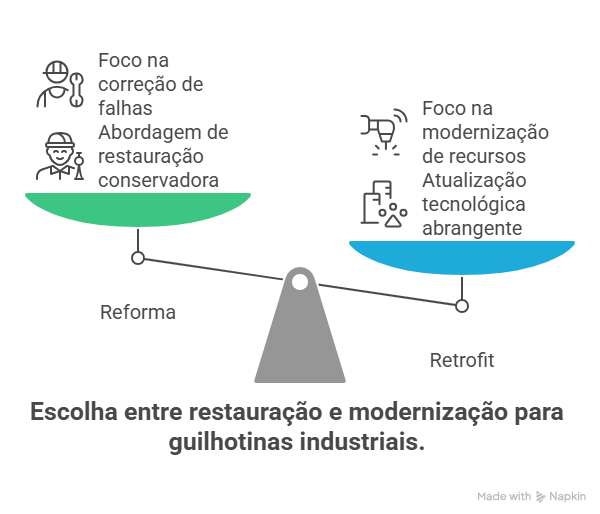 Enquanto a reforma é indicada para manter o funcionamento básico, o retrofit prepara a guilhotina para os desafios da produção industrial atual.